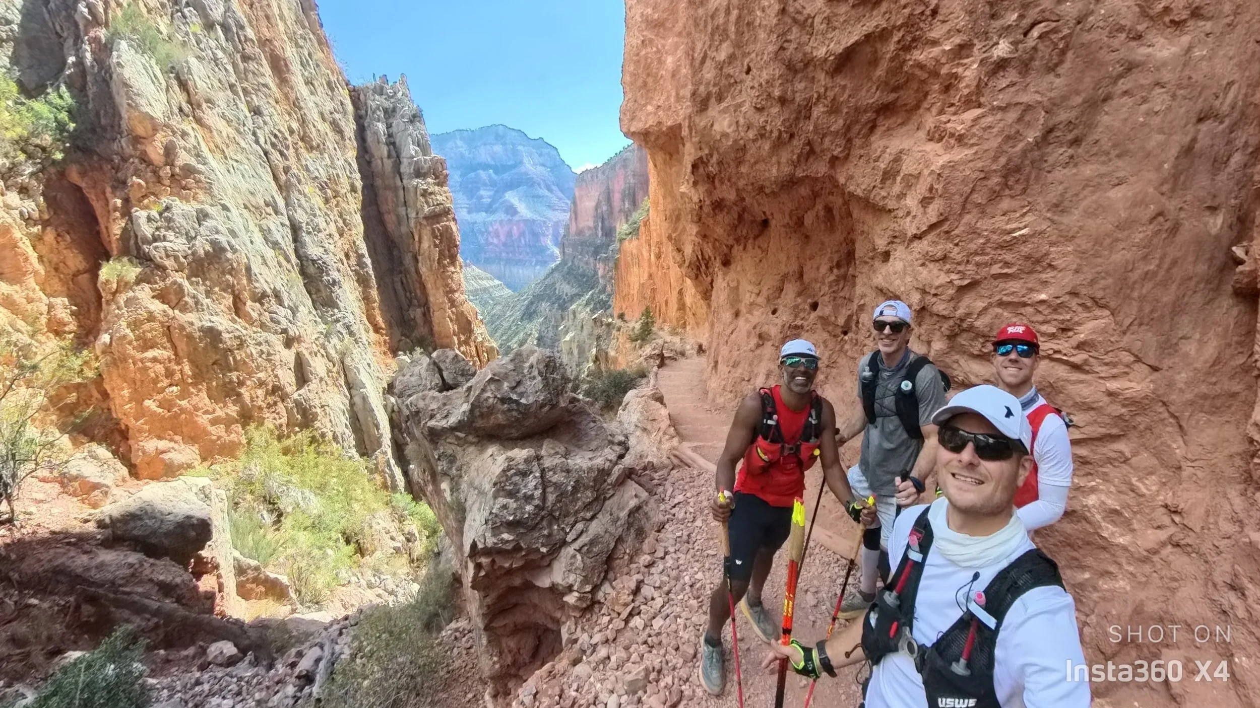 This pace was all on me. The other guys were charging and ready to get to the top, but I was on the struggle bus. My right hip also started hurting, which is weird because it never hurt once in all of my training. I was also struggling to get food down and was consuming water faster than I had intended. Luckily, with about 1.7 miles to the top, we ran into a ranger perched lazily at the corner of one of the switchbacks who told us that the Supai Tunnel water stop was working, which was welcome news to get a break, refill waters and soak my hat to cool down.